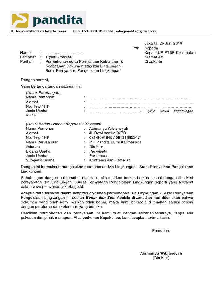 Surat permohonan kepada kepala dpmptsp yang di dalamnya menyatakan kebenaran dan keabsahan dokumen dan alasan pencabutan, tanda tangan dan materai rp. Pemohon izin harus menyampaikan lembar pernyataan keabsahan dokumen. Kartu izin tinggal terbatas (kitas. Pengantar rt/rw atau surat dari pengelola gedung, jika dalam perkantoran fotokopi ktp dan kk penanggungjawab usaha surat pernyataan penanggungjawab usaha surat pernyataan keabsahan dokumen sppt pbb dan bukti pembayaran pbb tempat usaha surat perjanjian sewa (jika tempat sewa) bukti kepemilikan tanah/bangunan (jika milik sendiri) foto lokasi usaha. Demikian pernyataan ini saya buat dengan sebenar benarnya, tanpa ada paksaan dari pihak manapun, dan untuk.